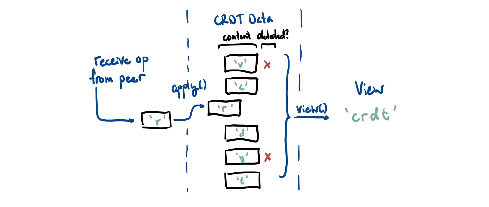 This gives us an ever-growing pile of messages that are deemed ‘safe’ to apply. Here is probably a good time to make a distinction between the data in the CRDT itself and the view of that data.