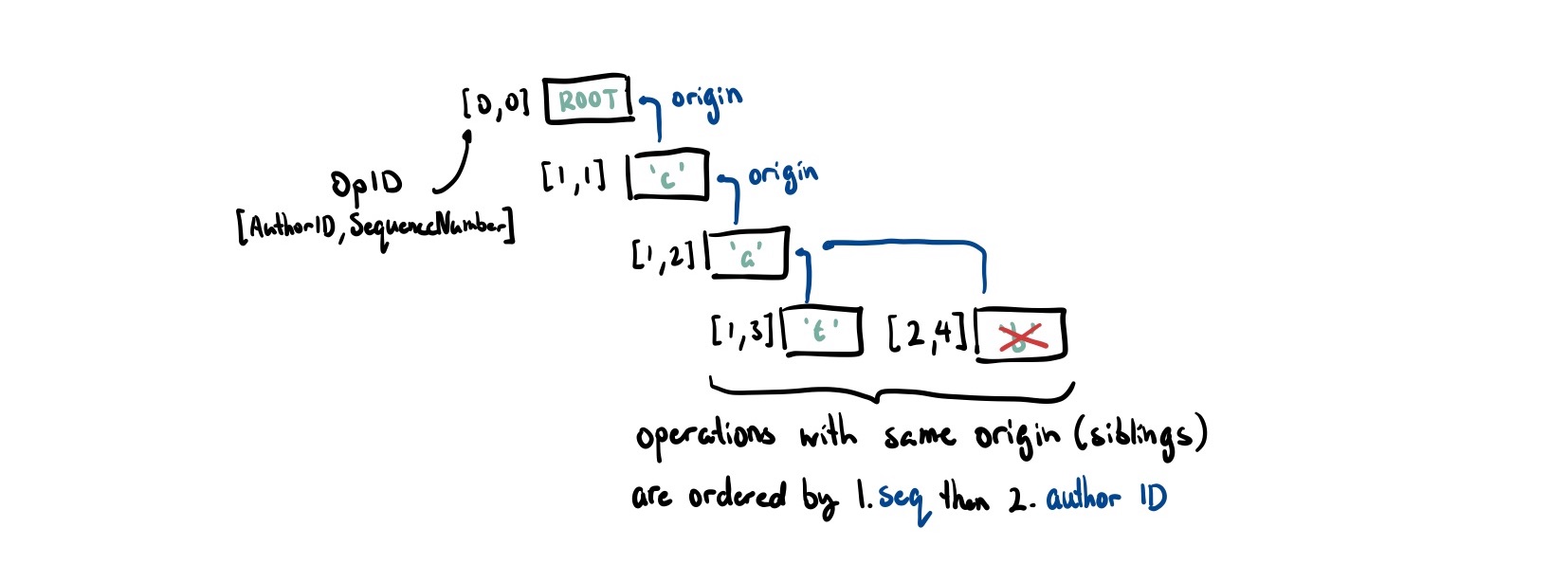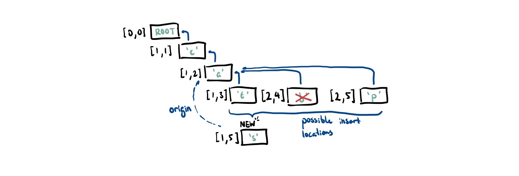 NB: performance enthusiasts will be quick to point out how to make this go faster. This is a terribly unbalanced tree. On average, it takes to find the origin and another to insert into the tree. There are clear optimizations to be made here. Yjs uses a doubly-linked list for a faster insert. They also use a cursor to track the last ~5-10 visited positions. It makes the assumption that editing patterns are not random (which is true for most applications). Diamond Types and the new Automerge use a range-tree to achieve find and insert ↩