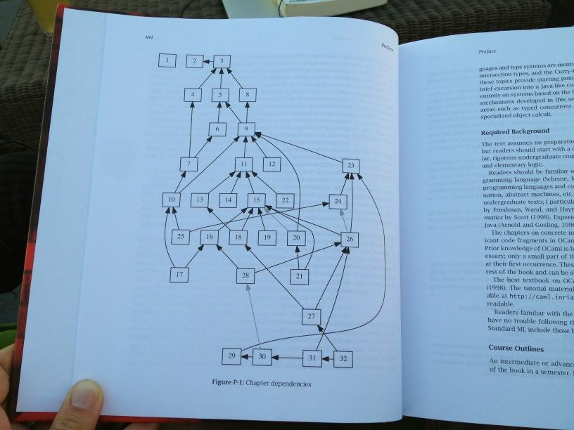 - If we drew a dependency graph of what each chapter depends on, this could help us sort out book order better (e.g. Types and Programming Languages)
