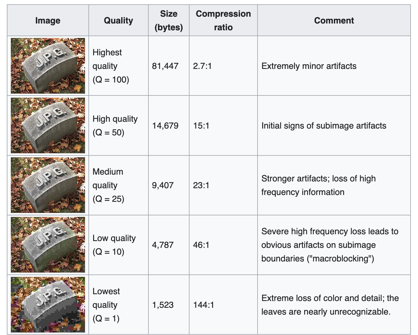 - JPEG gets around it by only choosing ‘visually important’ information to keep and either keeping around lower quality version of it or dropping it altogether