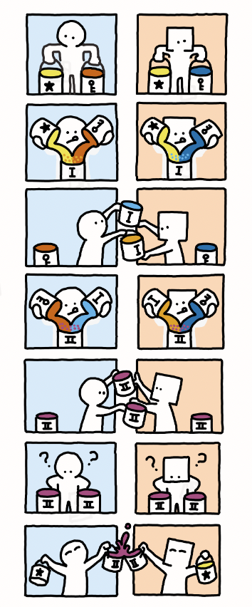 The process begins by having the two parties, Alice and Bob, publicly agree on an arbitrary starting color that does not need to be kept secret. In this example, the color is yellow. Each person also selects a secret color that they keep to themselves – in this case, red and cyan. The crucial part of the process is that Alice and Bob each mix their own secret color together with their mutually shared color, resulting in orange-tan and light-blue mixtures respectively, and then publicly exchange the two mixed colors. Finally, each of them mixes the color they received from the partner with their own private color. The result is a final color mixture (purple-brown in this case) that is identical to their partner’s final color mixture.