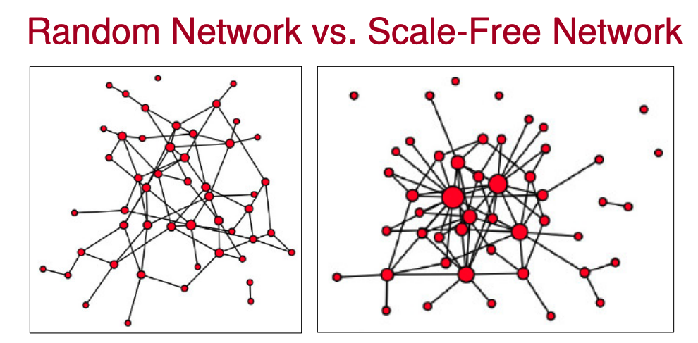 A scale-free network is a network where the degrees of connections of the nodes follows a power law (modelled by the Power Law , this is also where the concept of the 80/20 rule comes from). For example, roughly 80% of the web point to only 15% of the web pages.