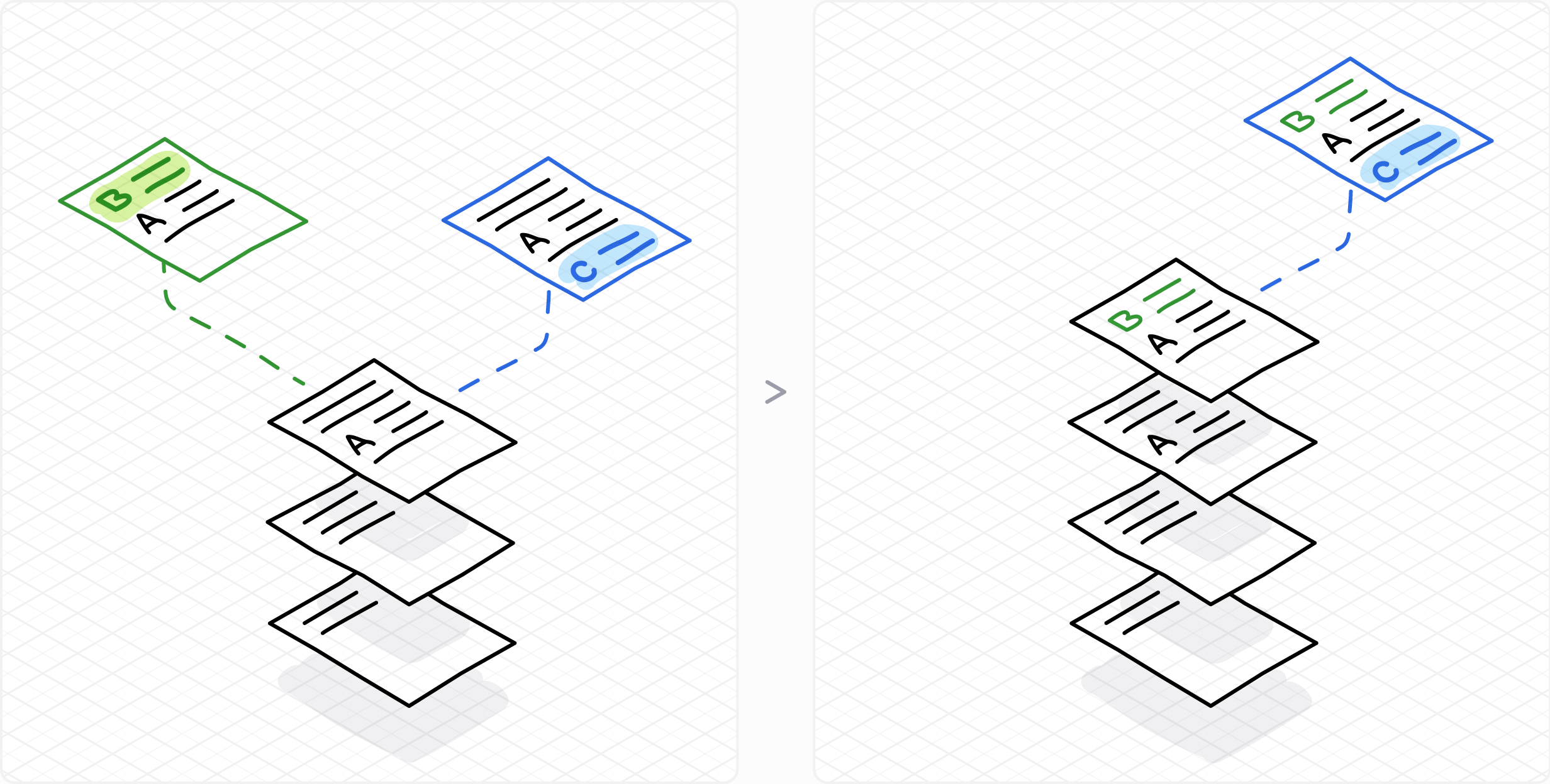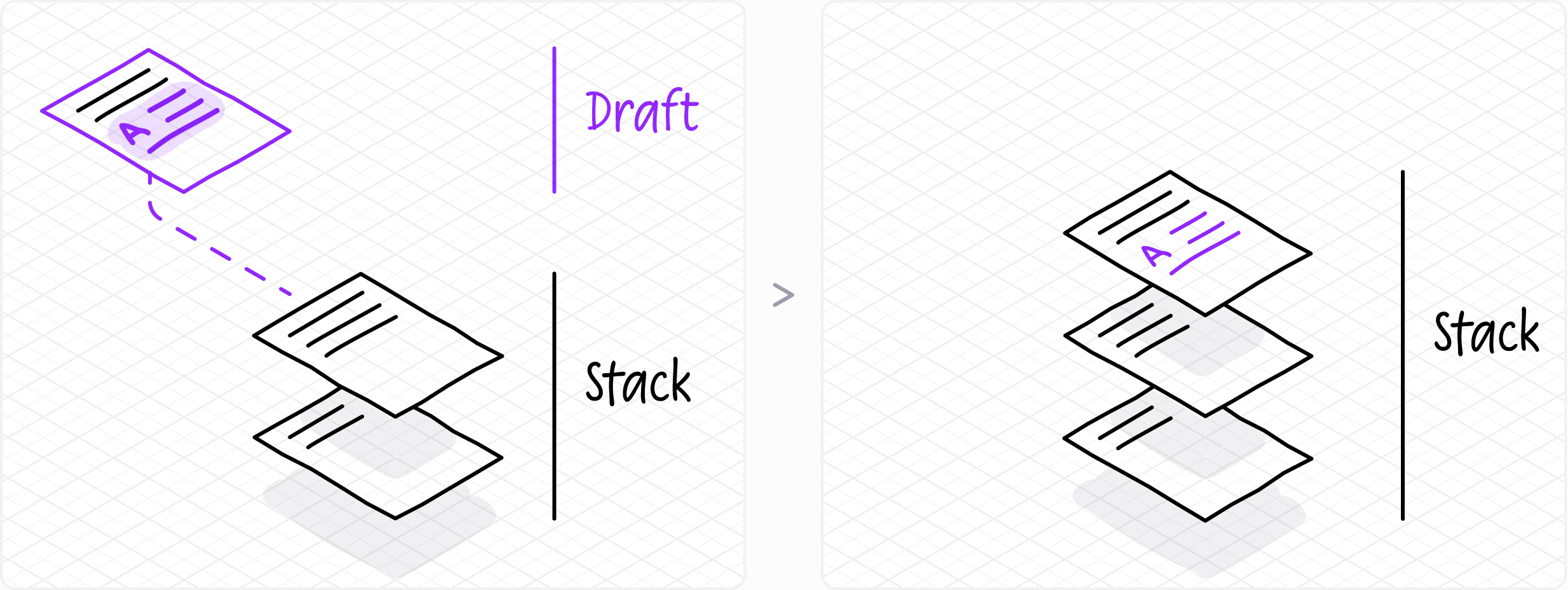 All drafts float on top of the stack of merged layers; when one draft is merged, all other drafts are updated to include the changes in the merged layer. Using a Git analogy, every time a branch is merged into main, all other branches are automatically rebased on top of the latest main: