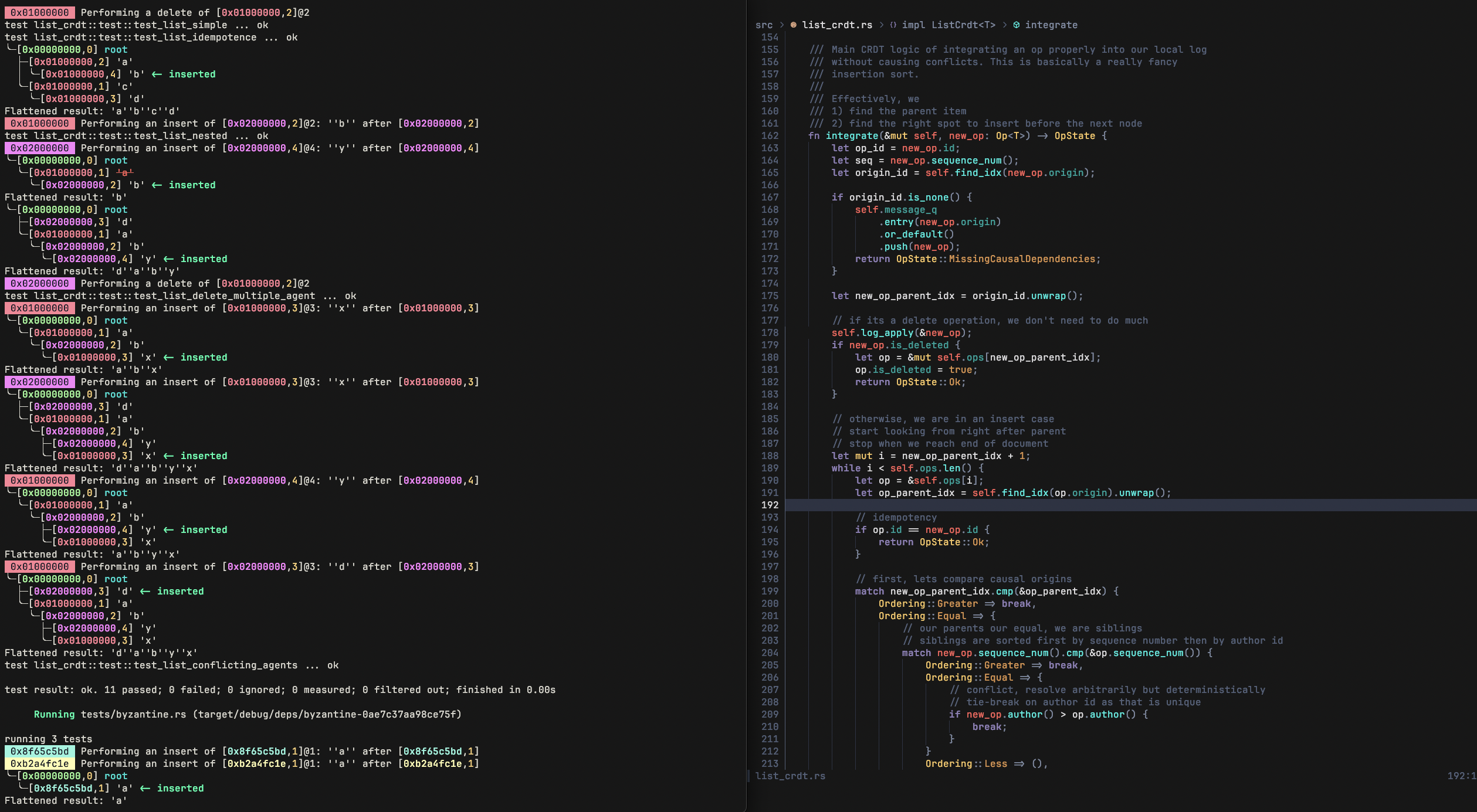 - A simplified Automerge-like CRDT in Rust with ideas from Martin Kleppmann’s 2022 paper on Making CRDTs Byzantine Fault Tolerant. The blog post also hit #3 on Hacker News the day it was released and has been featured in go-to resources for CRDTs.