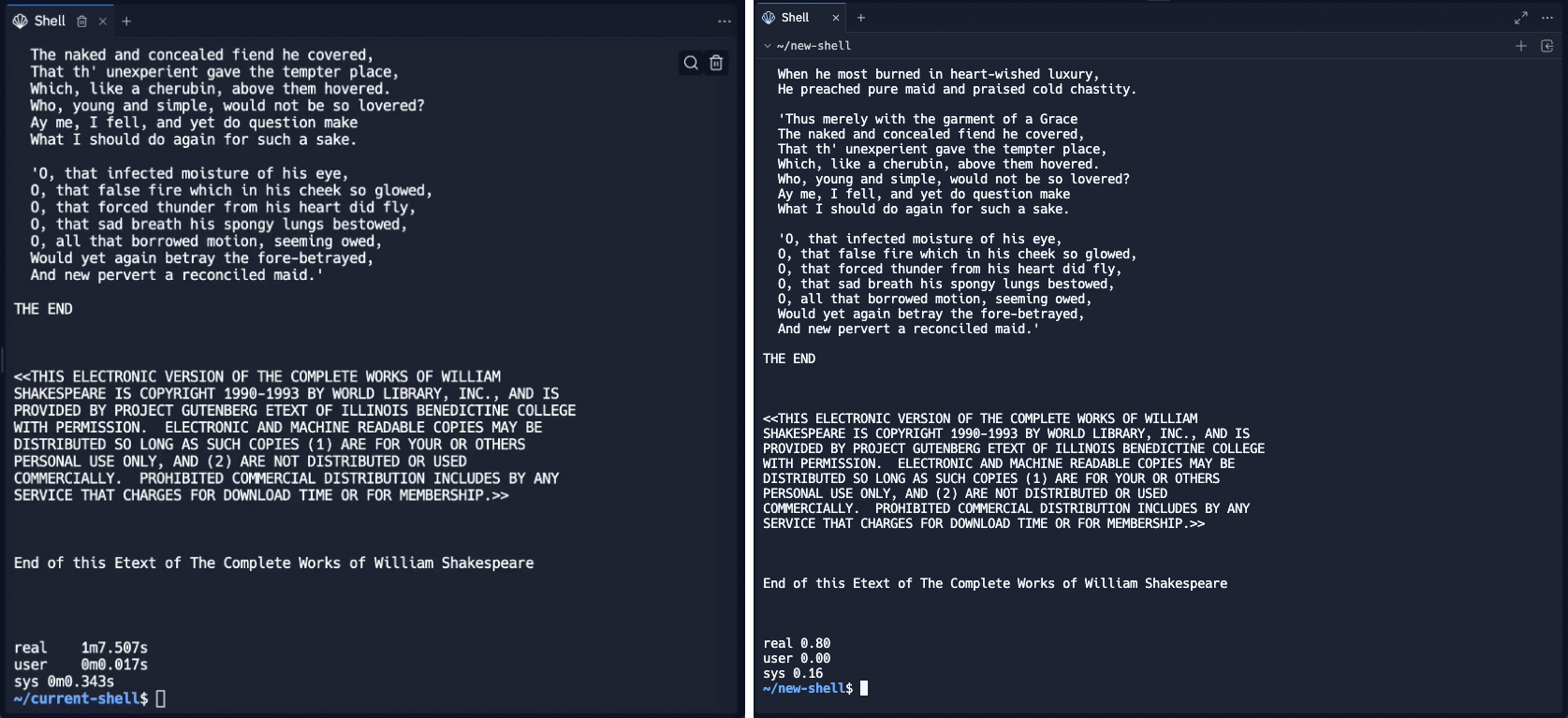 - This, in conjunction with River (below), allowed us to see a ~200x improvement in shell throughput. This means we can output all of Shakespeare’s collected works in about ~.2s instead of 67s!