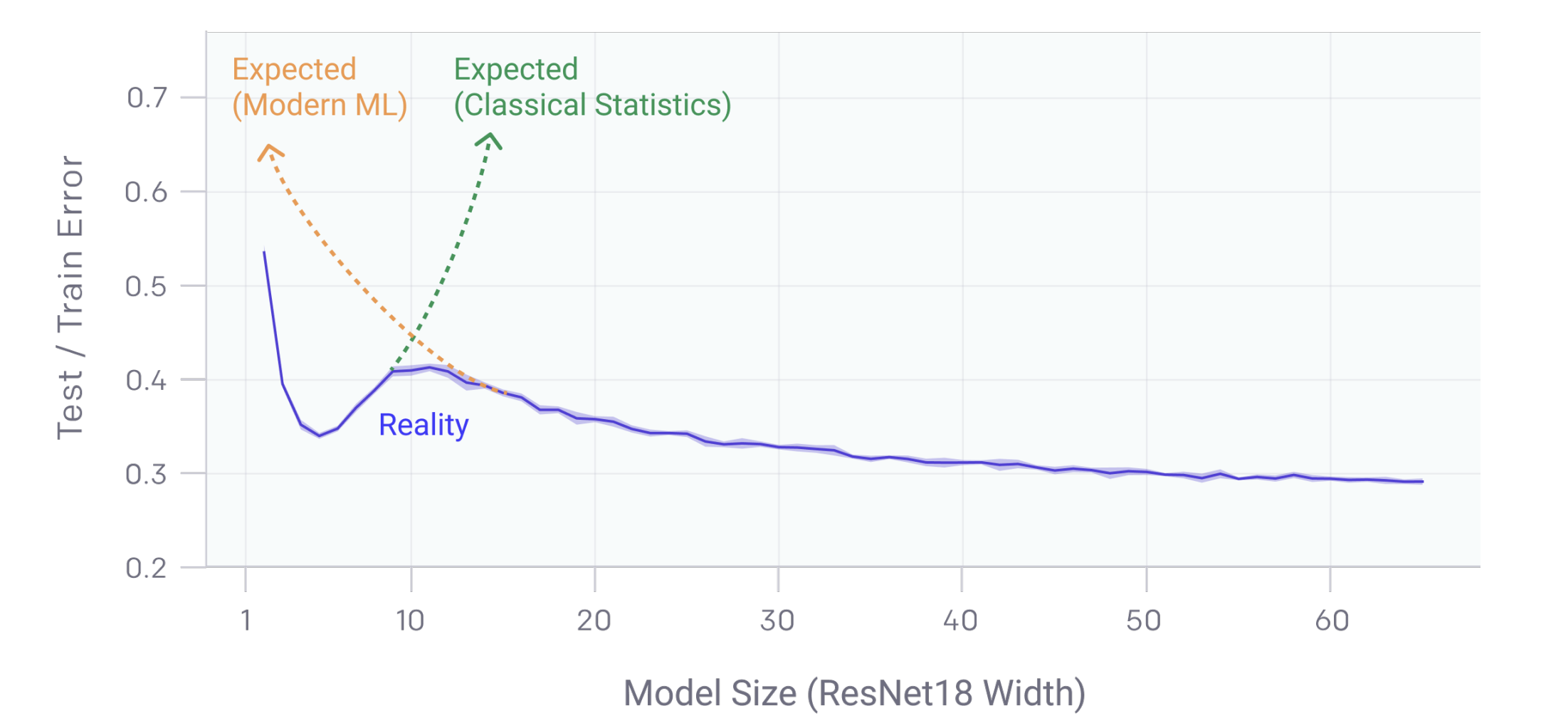 With small models, “minimize training error” leads to unique (or similar) global mins. With larger models, there is a lot of flexibility in the space of global mins (gap between best/worst).